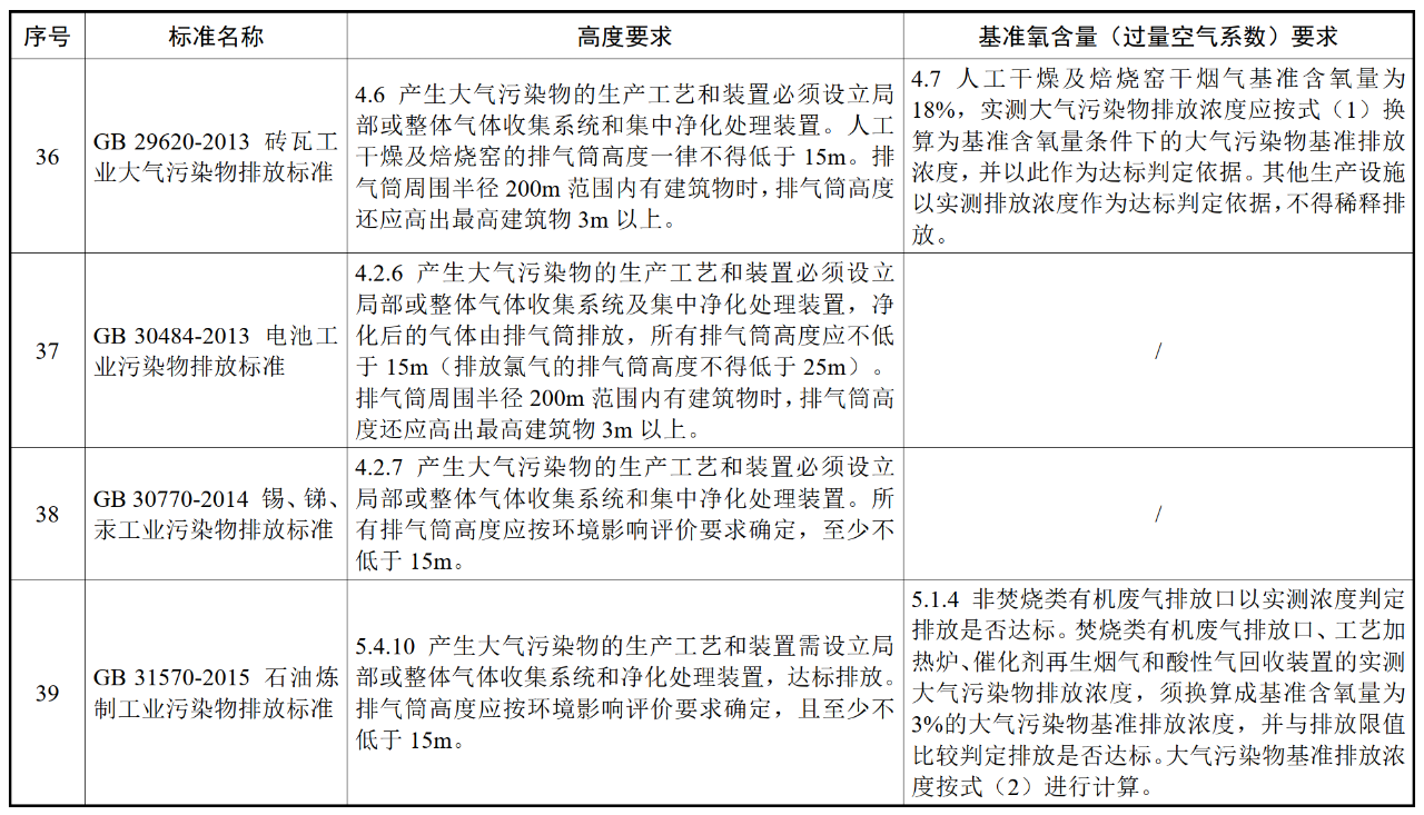 各行業(yè)大氣污染物(含VOCs)排氣筒高度及基準氧含量要求